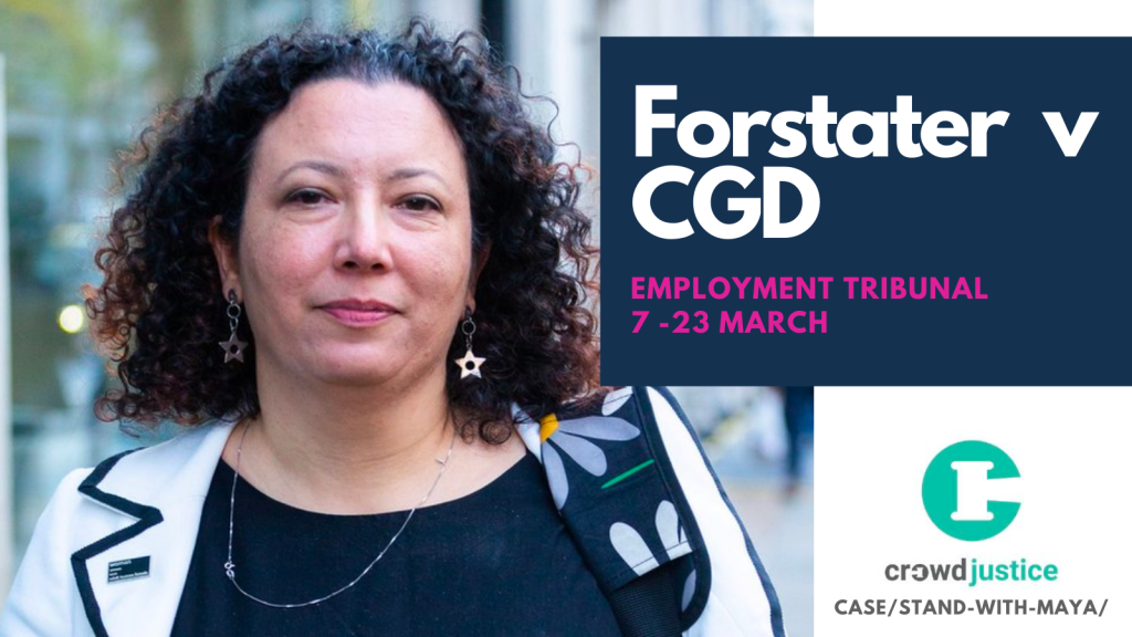 My name is Maya Forstater. I lost my job for speaking up about women’s rights and gender self-ID. I am taking took my ex-employer, the Center for Global Development, to employment tribunal for discrimination on the basis of belief.